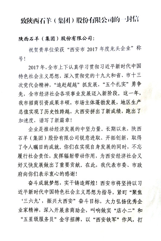 2018年10月10日上午,西安市農(nóng)業(yè)林業(yè)委員會組織召開了“西安市農(nóng)業(yè)龍頭企業(yè)50強授牌儀式暨龍頭企業(yè)負責人培訓會”。會上市農(nóng)委傳達了西安市委書記王永康表彰農(nóng)業(yè)龍頭企業(yè)50強的批示精神,為西安市農(nóng)業(yè)龍企業(yè)50強進行了授牌,并宣讀了王永康書記致石羊集團的一封信。